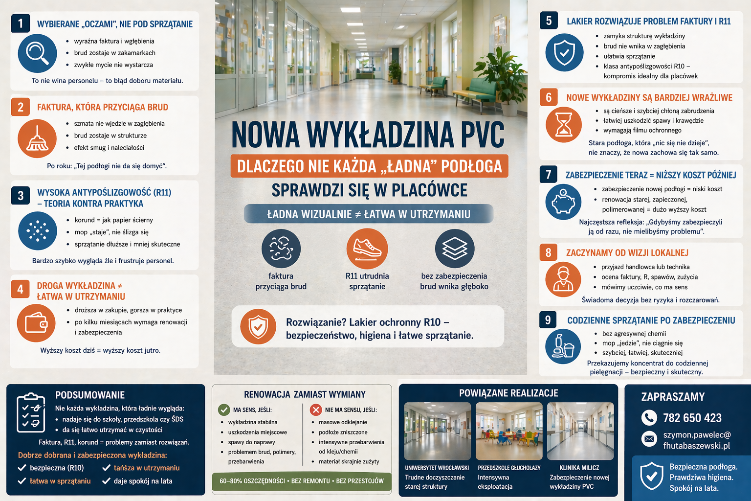 Zabezpieczenie lakierem daje powierzchnię o klasie R10, która jest wystarczająca dla większości placówek i jednocześnie łatwiejsza w utrzymaniu.
