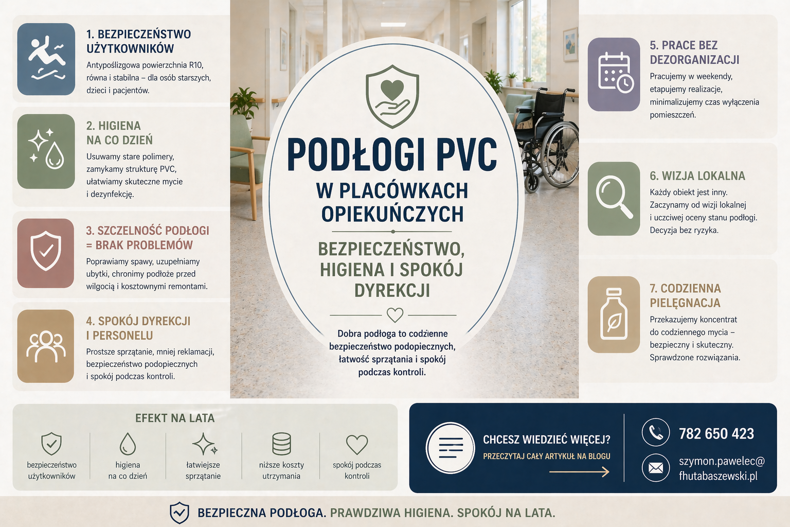 Z doświadczenia w ŚDS-ach, DPS-ach i placówkach opiekuńczych jasno wynika, że większość problemów z podłogami PVC nie wynika z zaniedbań, tylko z niewłaściwego podejścia do ich utrzymania.