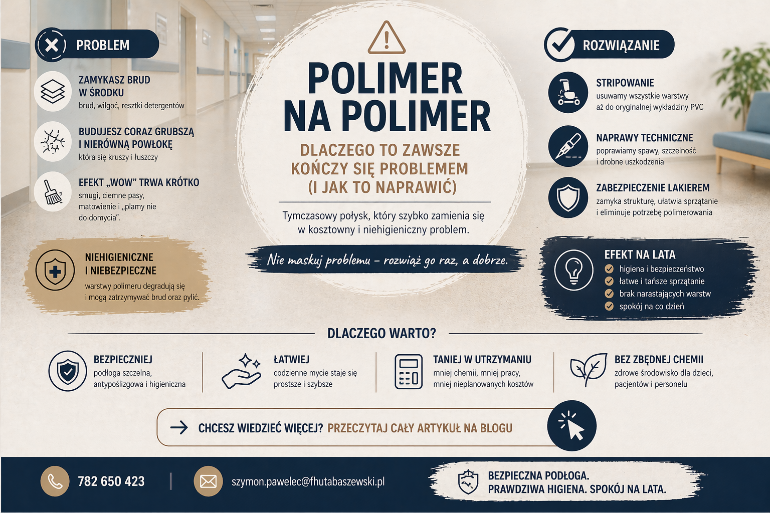 W wielu placówkach podłoga PVC „na chwilę wygląda lepiej”, bo dokładana jest kolejna warstwa polimeru. Często pojawia się podejście: szybki nabłysk i problem z głowy.