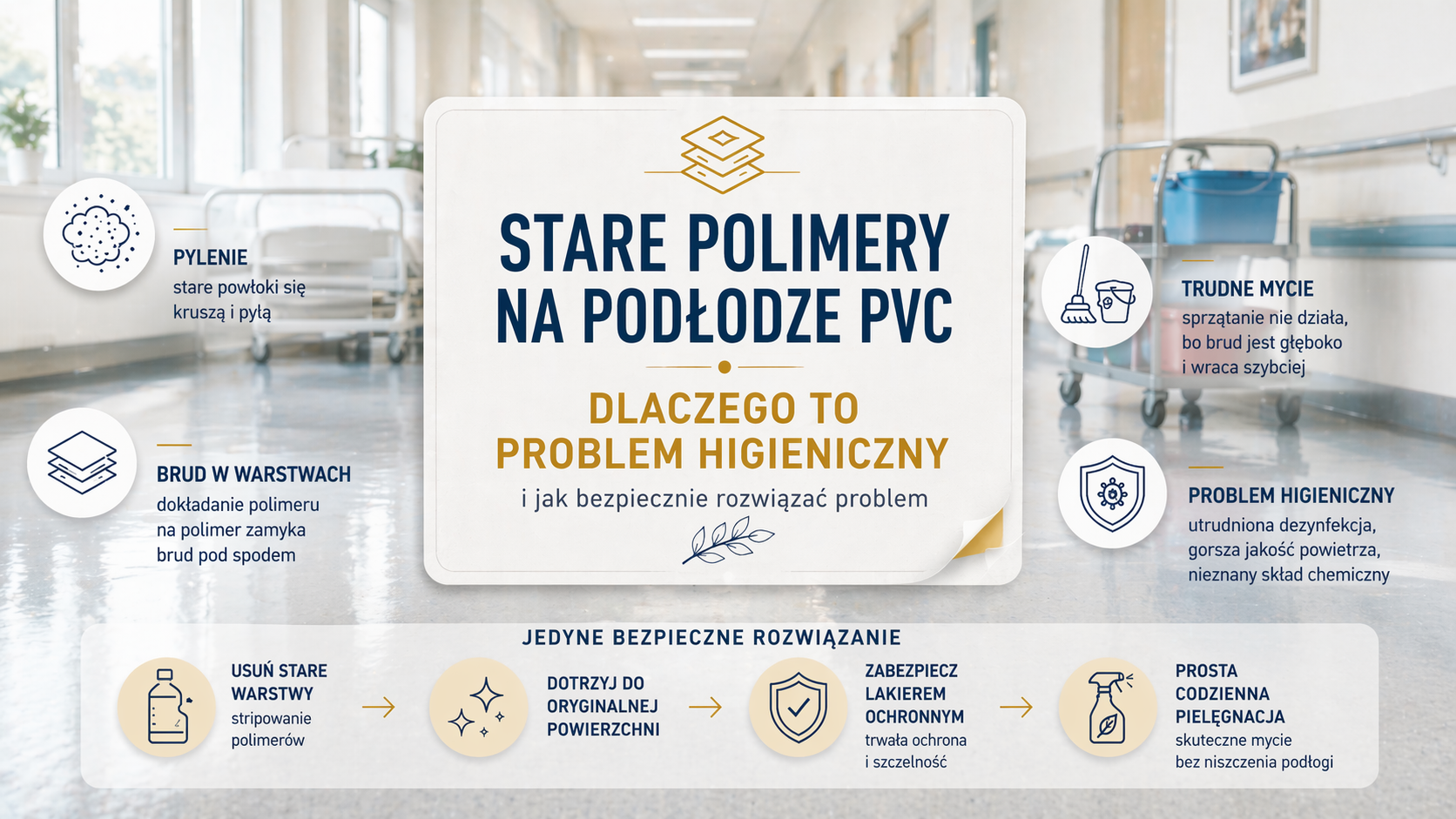 W wielu placówkach medycznych, opiekuńczych i edukacyjnych podłogi PVC przez lata były zabezpieczane poprzez dokładanie kolejnych warstw polimerów. Na pierwszy rzut oka dawało to efekt połysku i „odświeżenia”.